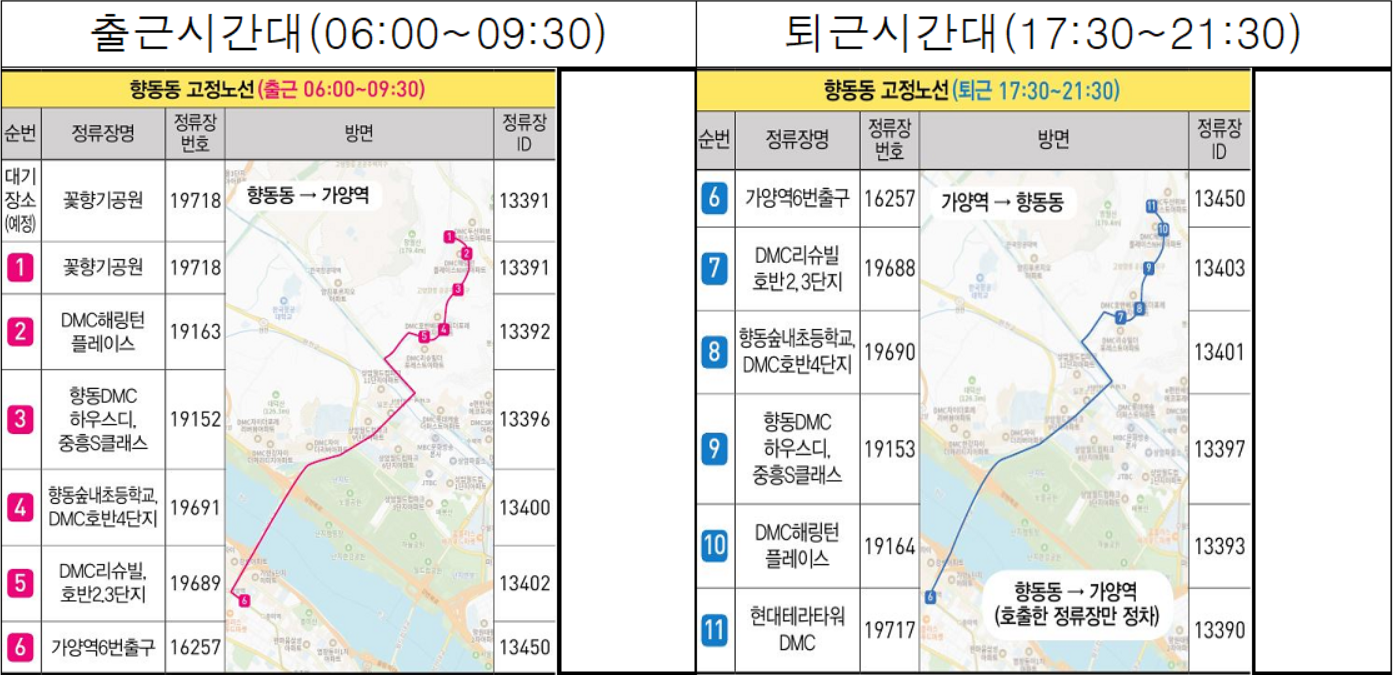 - 향동동 일원과 한국항공대역(경의중앙선), 가양역(9호선) 등 주요 거점을 운행합니다.