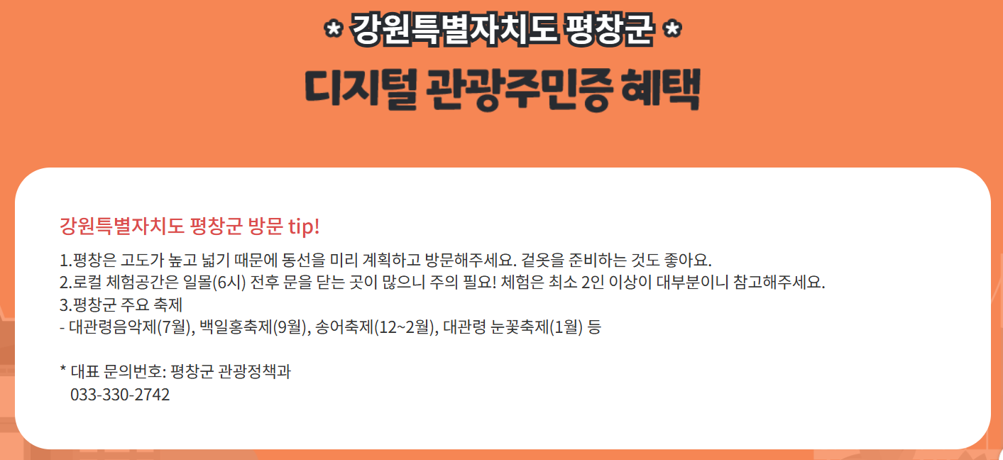 ● 강원도 평창군: 발왕산 케이블카 20% 할인, 바람마을 치즈 체험 10% 할인, 이효석 문학관 50% 할인