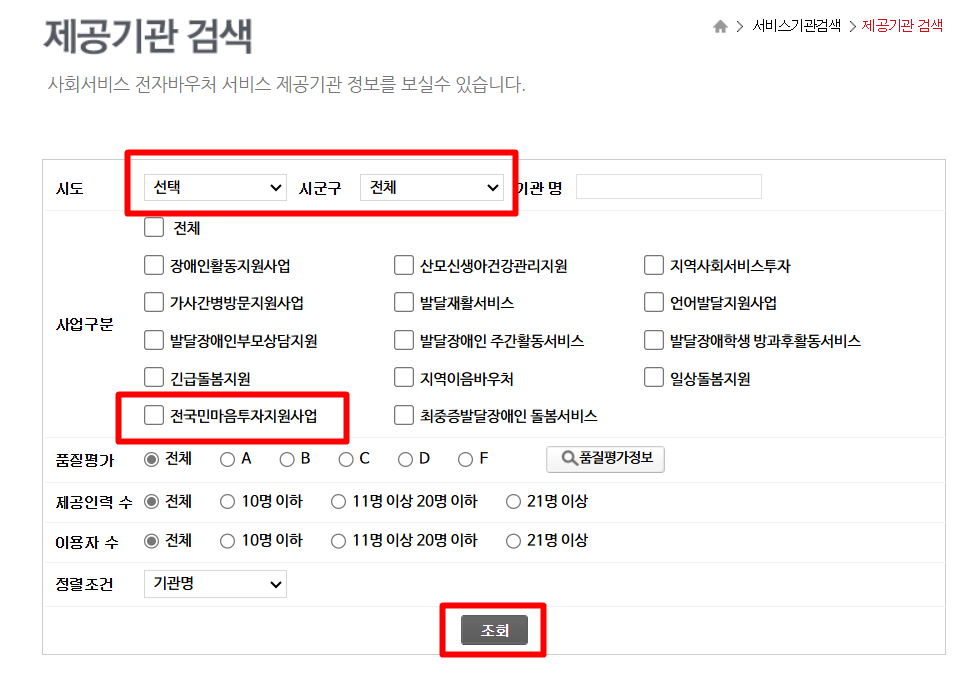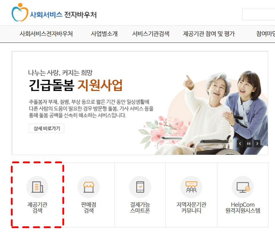 - 사회서비스 전자바우처 웹사이트: 제공기관 목록 확인