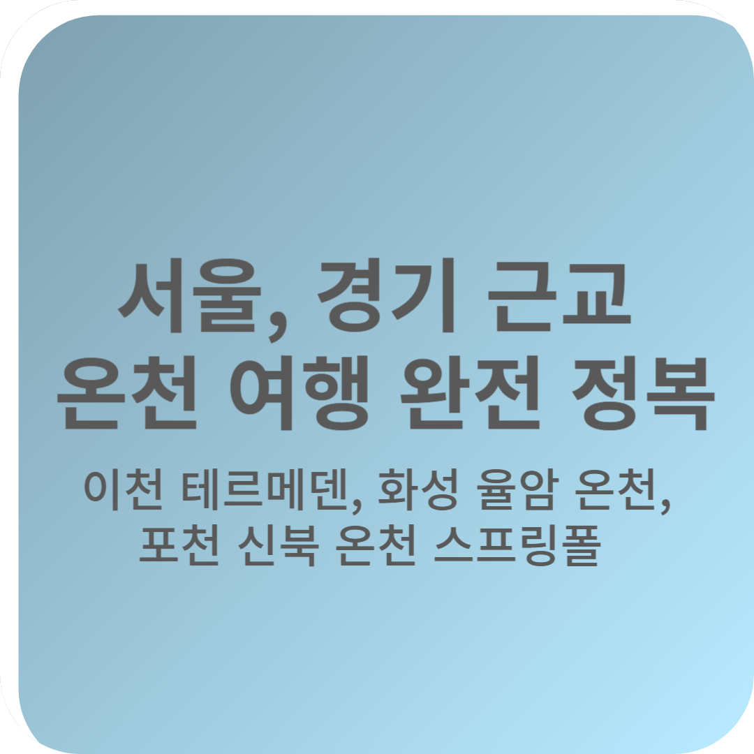 쌀쌀한 바람이 불어오는 계절, 따뜻한 온천수에 몸을 담그는 것만큼 행복한 순간이 또 있을까요? 서울 근교에는 짧은 이동 거리로 부담 없이 떠날 수 있는 온천 명소들이 많이 있습니다. 복잡한 도시 생활에서 벗어나 아름다운 자연을 감상하며 즐기는 온천욕은 지친 심신에 활력을 불어넣어 줍니다. 사랑하는 가족, 연인, 친구와 함께 떠나는 온천 여행은 소중한 추억을 만들고 더욱 돈독한 관계를 형성하는 좋은 기회가 될 것입니다.