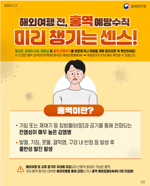 - 주의사항: 단체생활을 하는 청소년은 홍역 유행 시 감염 위험이 높으므로, 예방접종 및 개인위생 관리에 신경 써야 합니다. 홍역 유행 지역 여행 시 예방접종 필수