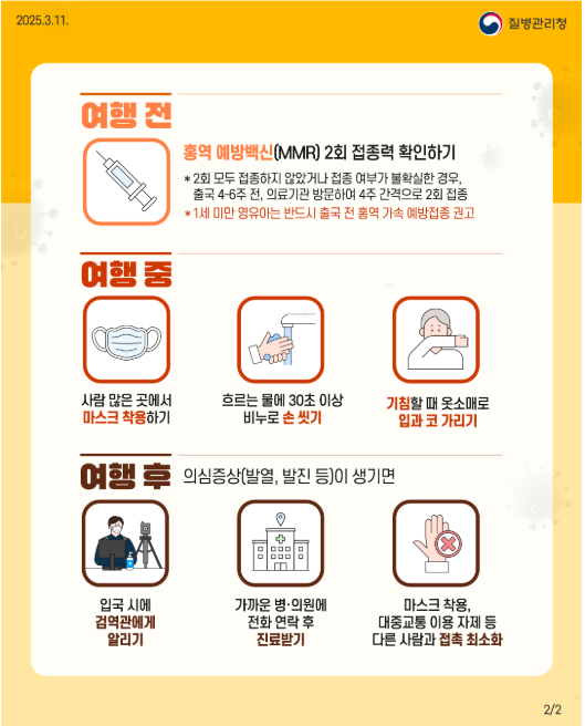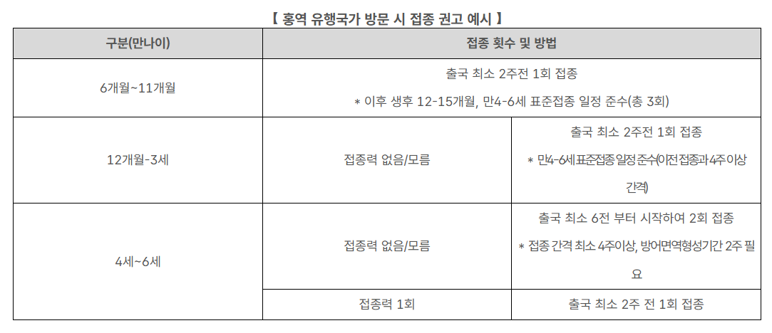 - MMR 백신은 4주 간격 2회 접종, 최소 출국 4주 전 1차 접종 권장
